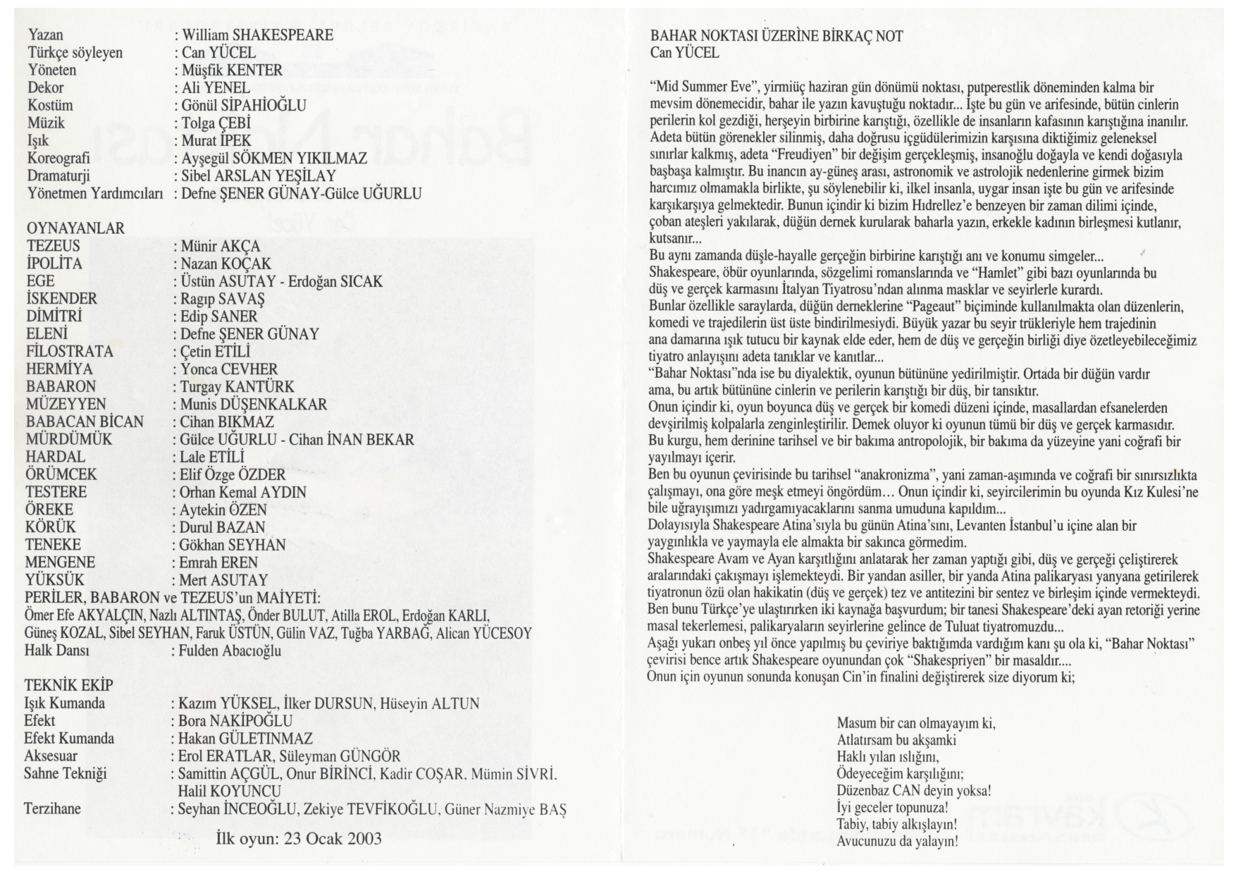Işık Kumanda - Kazımyüksel Efekt - Bora Nakipoğlu Efekt Kumanda - Hakan Gületınmaz Aksesuar - Erol Eratlar/ Süleyman Güngör Sahne Tekniği - Samittin Açgül/ Onur Birinci/ Kadir Coşar/ Mümin Sivri/ Halil Koyuncu Terzihane - Seyhan İnceoğlu/ Zekiye Tevfikoğlu/ Güner Nazmiye Baş